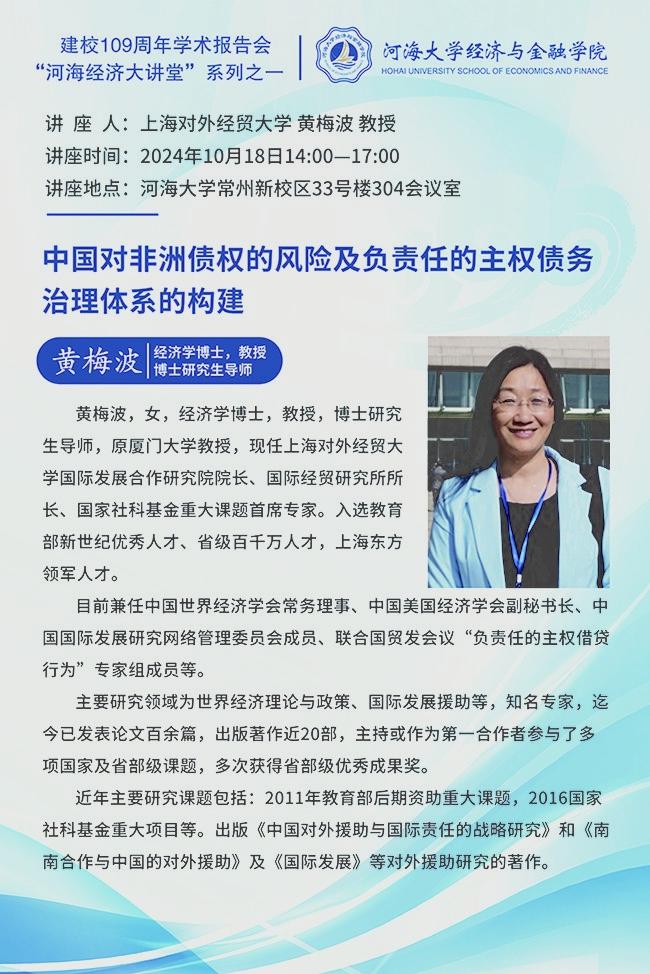 常州新校区33号楼304会议室 讲座人简介:黄梅波,女,经济学博士,教授,博士研究生导师,原厦门大学教授,现任上海对外经贸大学国际发展合作研究院院长、国际经贸研究所所长、国家社科基金重大课题首席专家。入选教育部新世纪优秀人才、省级百千万人才,上海东方领军人才。目前兼任中国世界经济学会常务理事、中国美国经济学会副秘书长、中国国际发展研究网络管理委员会成员、联合国贸发会议“负责任的主权借贷行为”专家组成员等。主要研究领域为世界经济理论与政策、国际发展援助等,知名专家,迄今已发表论文百余篇,出版著作近20部,主持或作为第一合作者参与了多项国家及省部级课题,多次获得省部级优秀成果奖。近年主要研究课题包括:2011年教育部后期资助重大课题,2016国家社科基金重大项目等。出版《中国对外援助与国际责任的战略研究》和《南南合作与中国的对外援助》及《国际发展》等对外援助研究的著作。